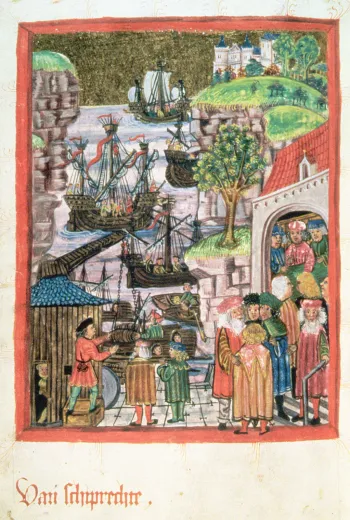 Однако эллины, будучи прирожденными моряками и владея высокой техникой живописи, марин не писали. И римляне не увлекались ими, разве что в их мозаиках иногда встречаются морские сцены, связанные с мифологией и рыбной ловлей. И художники городов Ганзы — а это были портовые города, чей флот доходил до тысячи судов, — не оставили после себя марин. Корабли на их книжных миниатюрах прописаны хорошо, со знанием дела и деталей, но видны лишь в гаванях, в качестве фона и символа главного инструмента бизнеса, как вот в миниатюре на шмуцтитуле Гамбургского права («Законы судоходства», 1475). И в XVI веке, когда кораблей стало еще больше, к тому же наступил расцвет живописи, марин не было. Видимо, большого количества художников, кораблей и моряков еще недостаточно для возникновения искусства морского пейзажа.