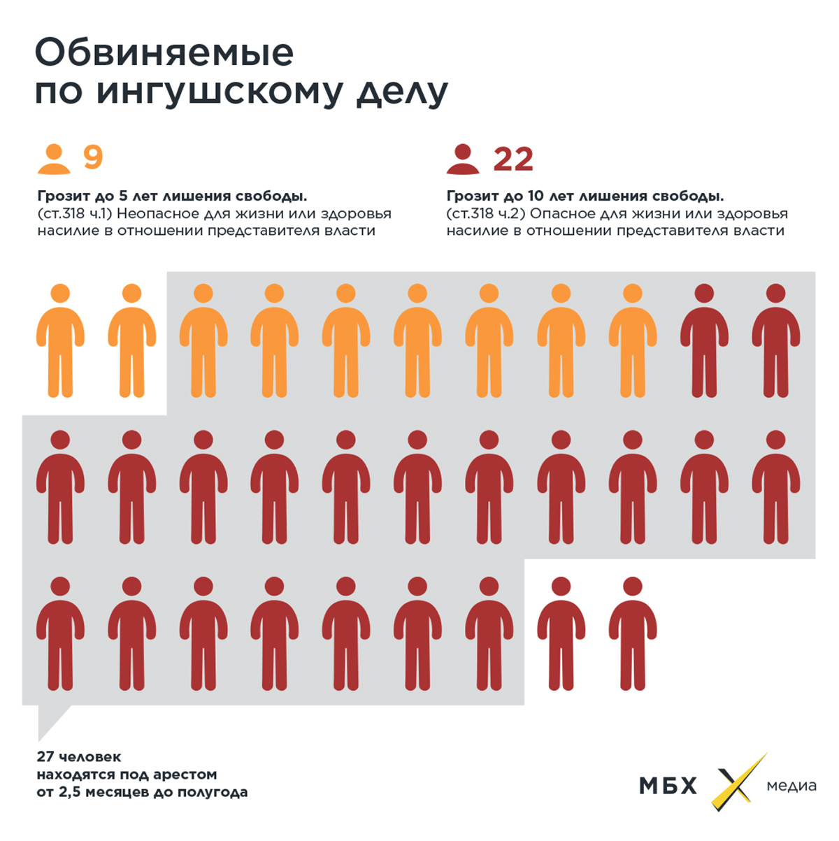 Лидеров протеста обвиняют в организации опасного для жизни и здоровья насилия над представителями власти (ч. 3 ст. 33, ч. 2 ст. 318 УК РФ). Максимальное наказание по этой статье — 10 лет лишения свободы. «Мне не приходилось раньше сталкиваться с такой конструкцией обвинения. Следствие по делу продлено до марта 2020 года, может затянуться и дольше. Видно, что они не торопятся», — рассказал «МБХ медиа» адвокат Вадим Клювгант, который защищает главу Совета тейпов Малсага Ужахова, члена Совета тейпов Ахмеда Барахоева, сопредседателя Всемирного конгресса ингушского народа Мусу Мальсагова и лидера движения «Опора Ингушетии» Бараха Чемурзиева. Такое же обвинение у активистов Исмаила Нальгиева и Зарифы Саутиевой.