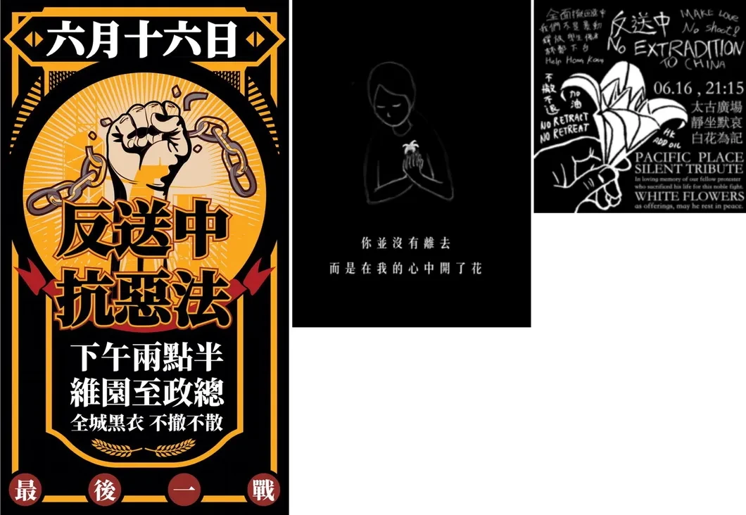 «Минута молчания на Пасифик-плейс в память о нашем друге-демонстранте, который пожертвовал своей жизню ради благородной борьбы. Белые цветы как подношения, пусть он покоится с миром». Автор неизвестен.