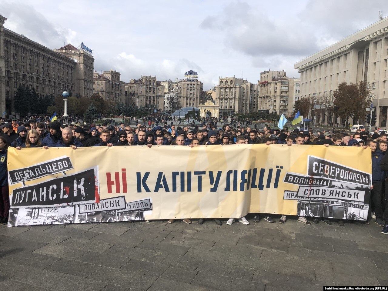 Поводом для уличной активности стало согласование на этой неделе на переговорах в Минске так называемой "формулы Штайнмайера", которая проясняет детали предоставления районам Донбасса, которые сейчас контролируются поддерживаемыми Россией сепаратистами, особого статуса. Участники акций протеста осуждают действия президента Владимира Зеленского, утверждая, что достигнутые договорённости могут вести к "капитуляции" Украины в конфликте с Россией.
