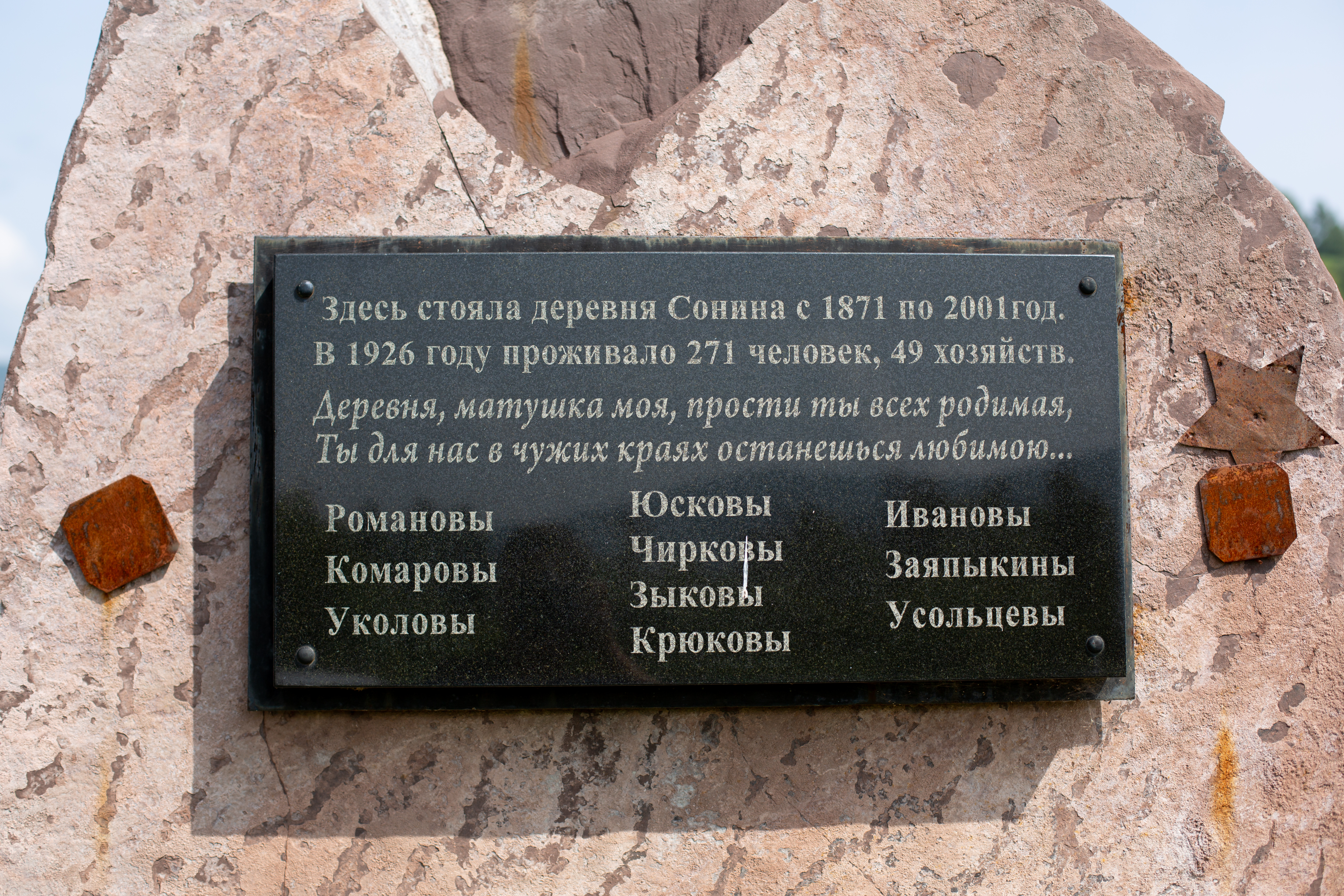 Александр Иванович зарабатывает тем, что при помощи специальной техники собирает сено в снопы. Дрова на зиму заготавливает взаимозачетом: договорился с соседом, который занимается лесозаготовкой в обмен на помощь в уборке сена. Наиболее масштабные вырубки березы происходят в окрестностях села Сонино, от которого теперь остался только мемориальный камень с памятной табличкой среди травы и рядом – сколоченный из досок стол с двумя скамейками. Сонино, которое значится на всех картах, опустело в 2001 году, когда селу было 130 лет.
