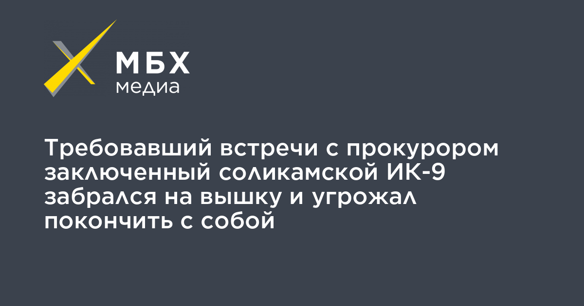 В соликамской исправительной колонии №9 в ночь на 7 октября заключенный залез на вышку и угрожал покончить с собой, требуя встречи с прокурором. Об этом в фейсбуке написал основатель сообщества Gulagu.net Владимир Осечкин.