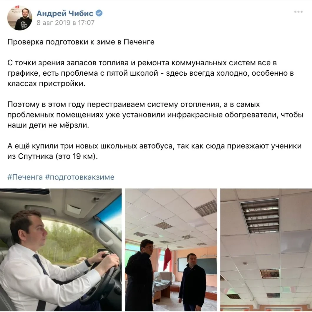 В поселке Печенга, тоже в Мурманской области, в местной школе много лет замерзают дети. На утепление здания нет денег, и когда в канун сентябрьских выборов в школу с инспекцией приехал тогдашний врио губернатора, в школе быстренько установили инфракрасные обогреватели. Которые СанПиНами запрещены даже к временному использованию в детских учреждениях.