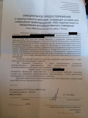 «Звереву Сергею Анатольевичу объявляется официальное предостережение о недопустимости действий, создающих условия для совершения административного правонарушения, а также продолжения противоправоного и (или) антиобщестенного поведения», — пишут силовики.