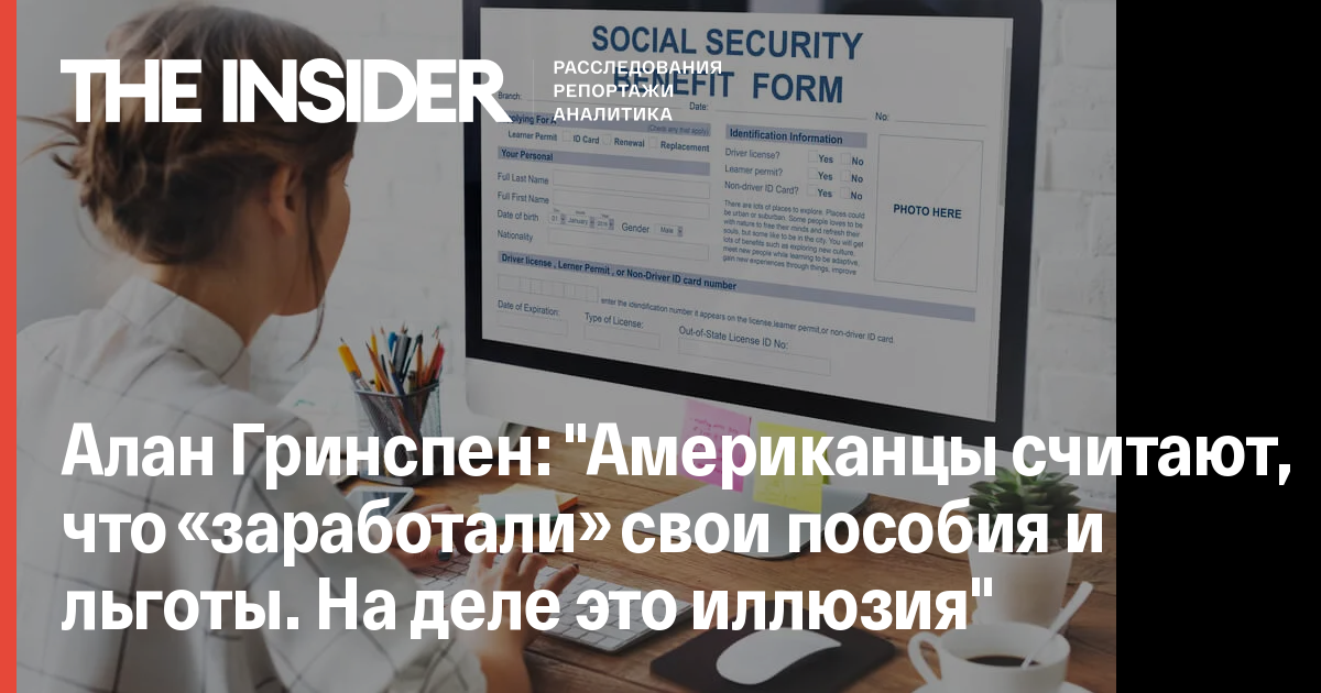 Бывший глава ФРС Алан Гринспен и журналист Адриан Вулдридж считают, что главная причина стагнации американской экономики связана с политикой социальных пособий и льгот. «Американцы предпочитают считать, что они «заработали» свои пособия и льготы: они просто получают обратно с процентами то, что вложили в трастовые фонды. <...> В одном из рекламных роликов Американской ассоциации пенсионеров главный герой заявляет: «Я заработал свою Medicare и свою пенсию». На деле это иллюзия. В целом американцы вкладывают меньше, чем получают», - The Insider публикует отрывок из книги «Капитализм в Америке: история», которая выходит в издательстве «Альпина Паблишер».