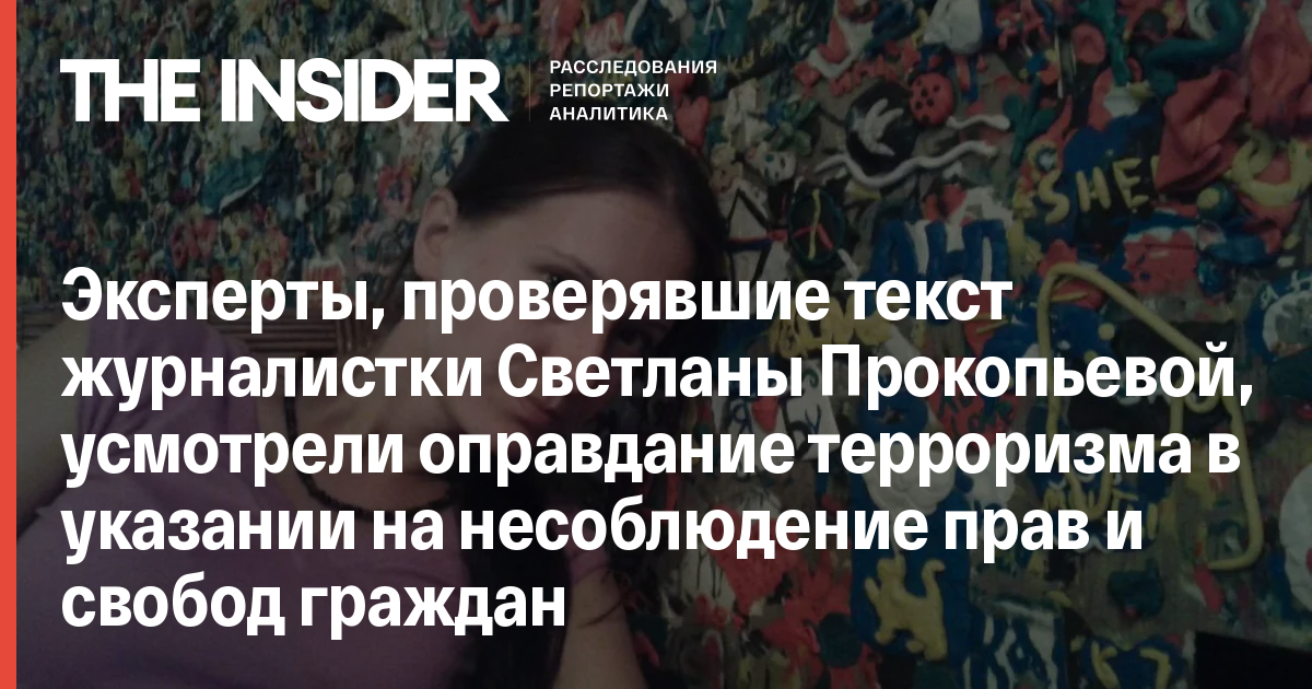 Лингвисты и психологи, проводившие экспертизу, на основании которой журналистку Светлану Прокопьеву обвинили в оправдании терроризма, нашли нарушение закона в указании на несоблюдение «прав и свобод граждан» в России, сравнении взорвавшего себя подростка в здании архангельского ФСБ с народовольцами и отсутствии негативной оценки его действий. Об этом пишет РБК со ссылкой на выводы экспертиз.