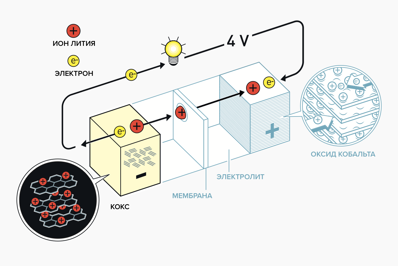 В заряженном состоянии ионы лития в аккумуляторе сидят в удобных для них шестиугольных ячейках, образованных углеродными атомами в коксе (у ранних аккумуляторов) или в графите (у современных). Когда к устройству подключают нагрузку, атомы лития покидают свои посадочные места, оставляя в них свои электроны. После этого они и устремляются к противоположному электроду, где для лишенных электронов ионов находятся еще более удобные (в химическом смысле) посадочные места. А оставленные в графите электроны устремляются в электрическую цепь, производят работу и в конце концов возвращаются в аккумулятор, только уже на противоположном его конце. Когда устройство ставят на зарядку, все повторяется с точностью до наоборот.