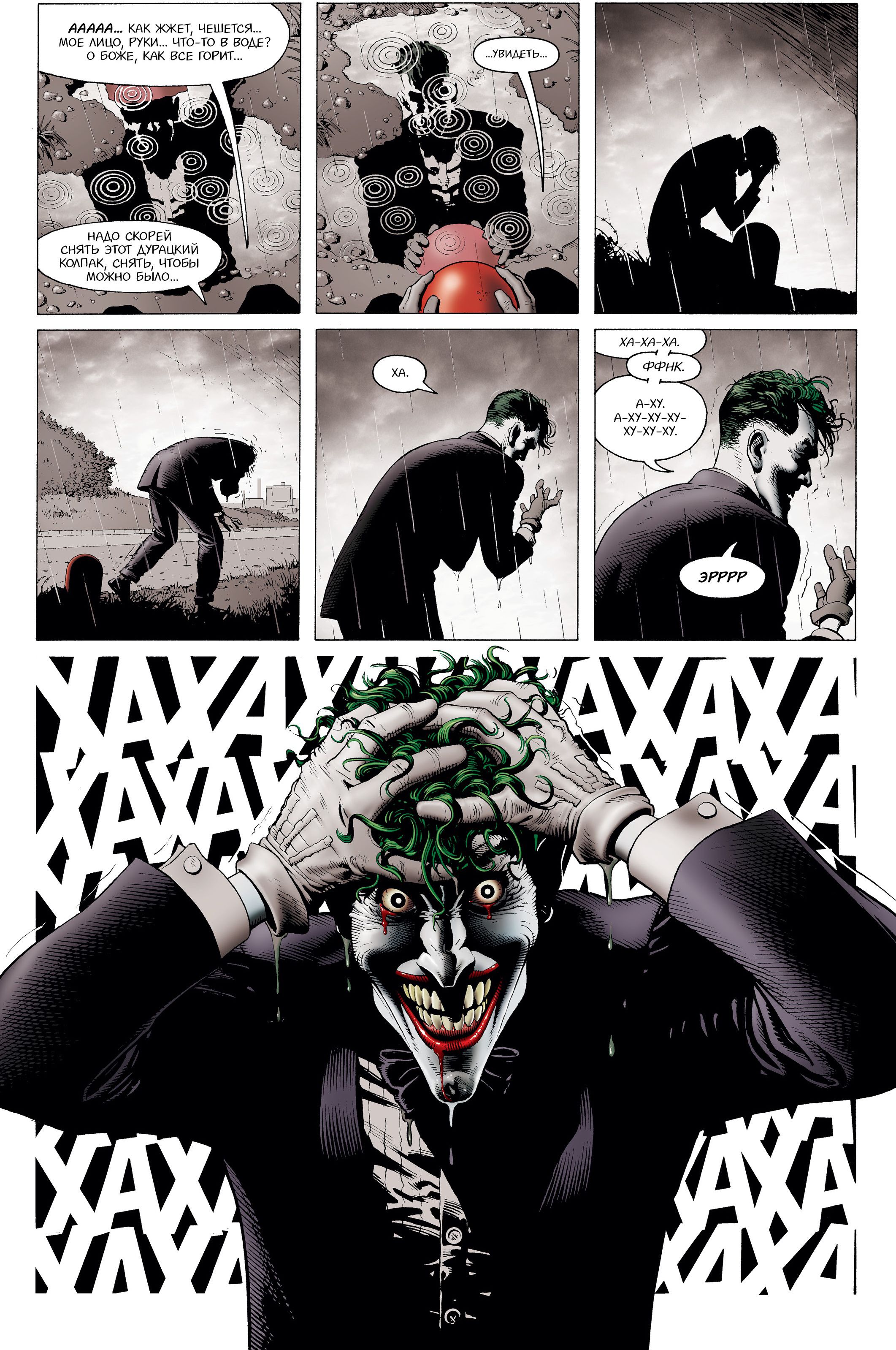 Предыстория главного врага Бэтмена — Джокера — была рассказана в 1988 году в комиксе Алана Мура и Брайана Болланда «Убийственная шутка». По сюжету Джокер сбегает из психиатрической клиники Аркхэм, стреляет в дочь комиссара Гордона Барбару, а самого главу готэмской полиции похищает и пытается свести с ума. Параллельно злодей вспоминает о своем прошлом: раньше он был простым инженером. Чтобы зарабатывать на жизнь своей семьи (у него была беременная жена), он стал комиком, но дела его шли неудачно. В поисках больших денег герой связался с бандитами, которые подставили его. Спасаясь от Бэтмена, преследующего инженера, герой нырнул в бочку с химикатами и приобрел вид Джокера. Раны, злость и горечь утраты (жена героя погибла) свели его с ума — и он превратился в убийцу.