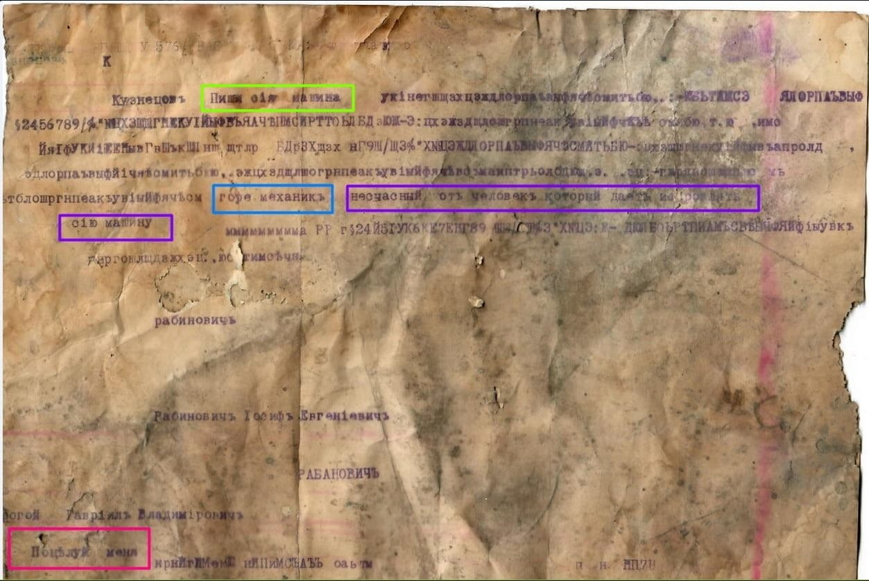 Среди неразборчивых записей встречаются и фразы: «поцелуй меня», «горе механикъ», «несчасный тотъ человекъ который даетъ исправлять сiю машину», «пиши сiя машина». Обратная сторона листа начинается со слов «Милостивый Государь», однако продолжение записи запечатано поверх и не читается.