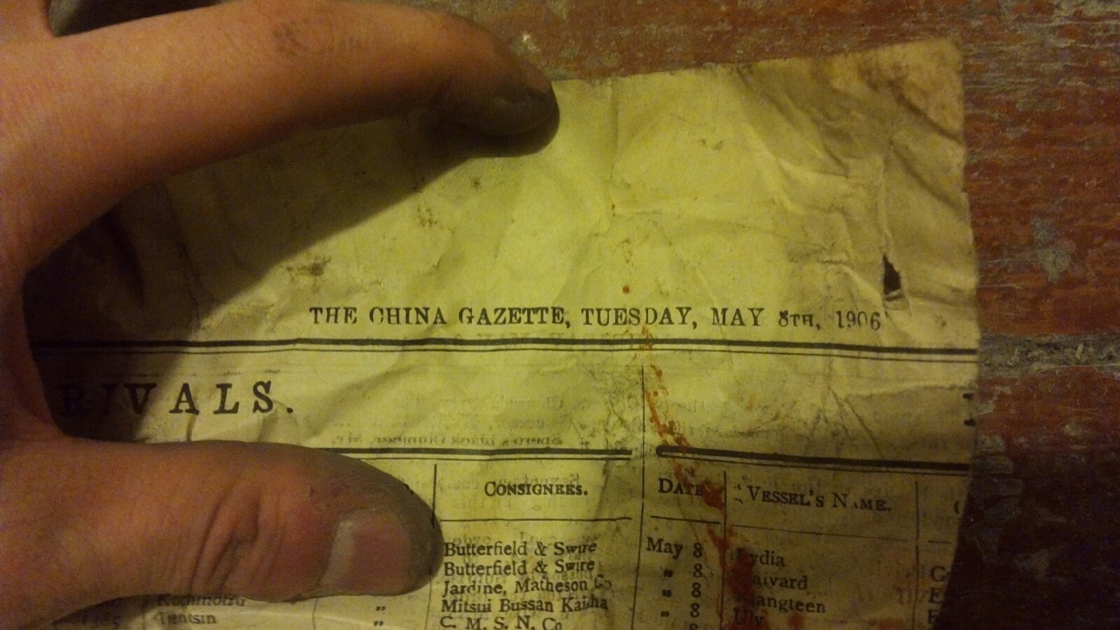 Самые старинные находки из «тайной комнаты» — газеты 1906 года на английском языке, привезенные с Дальнего Востока. Жильцы предполагают, что их оставили двое писарей военного министра Российской Империи. Вероятно, они жили в помещении над аркой.