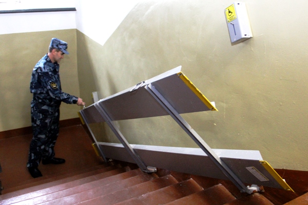 Пандусы откидные. Их закрепили к стенам, при необходимости их можно опустить на лестницу, чтобы человек в коляске мог спуститься или подняться. Опускать конструкции могут только сотрудники изолятора — без них перемещаться по учреждению нельзя. Три камеры в СИЗО оборудованы поручнями, специальным унитазом и светодиодным светильником и кнопкой вызова. Поручни появились в душевой.