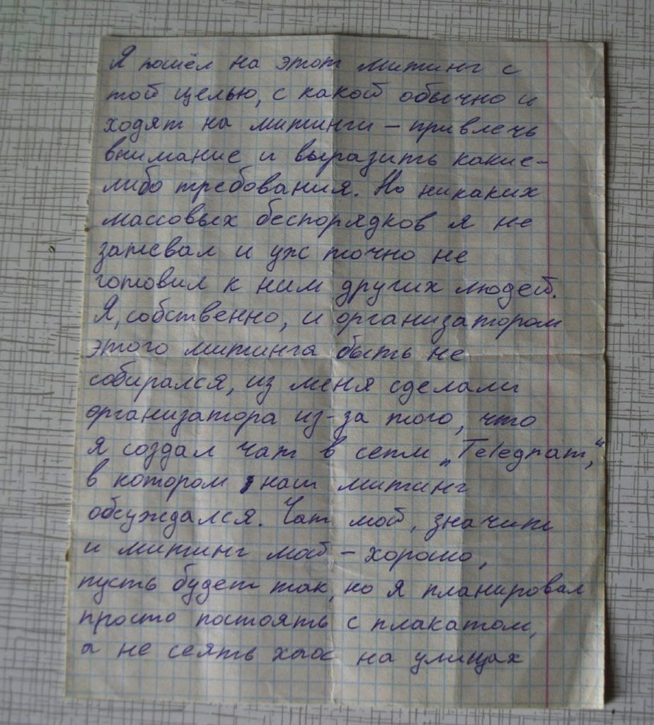 Письмо ВладаФото: Светлана Ломакина «Я пошел на этот митинг с той целью, с которой обычно и ходят на митинги — привлечь внимание и выразить какие-либо требования. Но никаких массовых беспорядков я не затевал и уж точно не готовил к ним других людей. Я, собственно, и организатором этого митинга быть не собирался, из меня сделали организатора из-за того, что я создал чат в сети Telegram, в котором наш митинг обсуждался. Чат мой, значит, и митинг мой — хорошо, пусть будет так, но я планировал просто постоять с плакатом, а не сеять хаос на улицах. Видимо, мы выбрали неудачную дату, но выбрали мы ее потому, что ожидали в этот день большого количества людей на улицах, в связи с чем мы сможем привлечь к себе больше сторонников и внимания…»