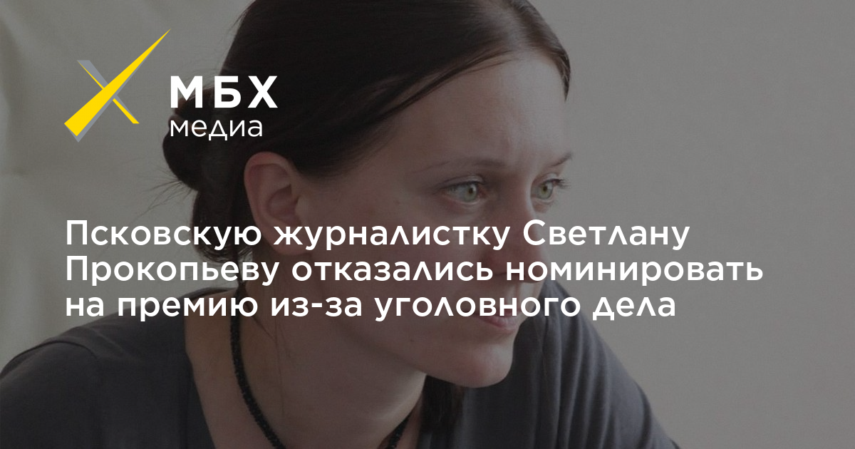 Псковскую журналистку Светлану Прокопьеву, обвиняемую в публичном оправдании терроризма из-за программы на “Эхе Москвы”, отказались выдвигать на премию «Народное признание» в номинации «Поступок» из-за уголовного преследования. Об этом «МБХ медиа» сообщил экс-глава регионального объединения Либертаринской партии Николай Рассадин.