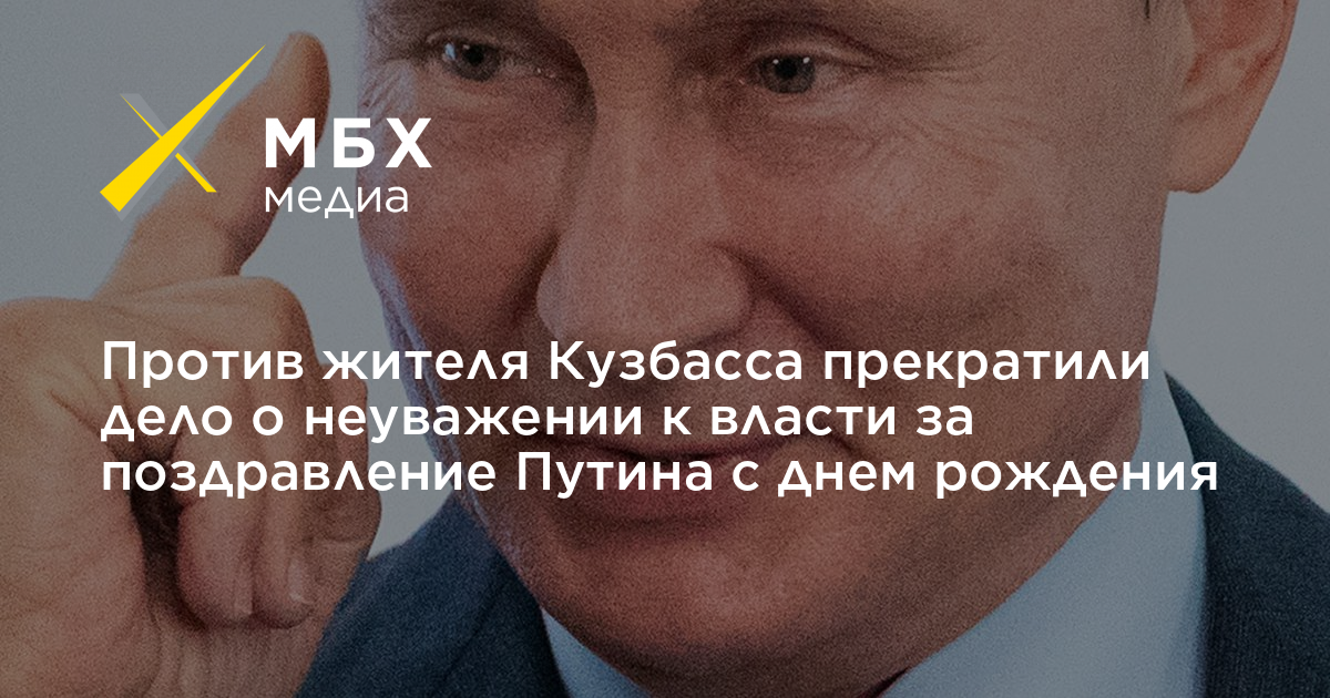 Против жителя Кемеровской области Ильи Путевского прекратили дело о неуважении к власти (часть 3 статьи 20.2 КоАП) за поздравление Владимира Путина с днем рождения. Об этом Путевский сообщил «МБХ медиа».