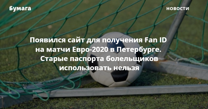 Оргкомитет чемпионата Европы-2020 по футболу в Петербурге объявил о запуске сайта, где можно подать заявку на получение паспорта болельщика (Fan ID), необходимого для посещения матчей. Он обязателен для всех зрителей матчей.