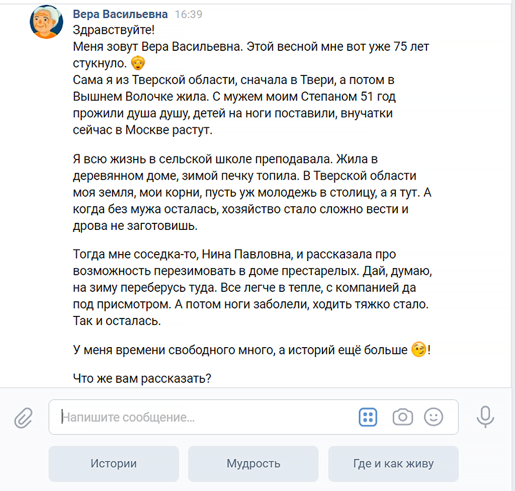 Например, у фонда «Старость в радость» есть «самый душевный» бот, 75-летняя пенсионерка Вера Васильевна. Она рассказывает обо всех направлениях работы фонда и делится с волонтерами полезными контактами, тем самым решая задачу моментальных ответов на постоянно повторяющиеся вопросы. Также чат-бот может регулярно рассылать новости фонда и рассказывать о ближайших волонтерских поездках и мероприятиях. Кроме того, Вера Васильевна участвует в программе «Внуки по переписке», помогая желающим написать настоящее письмо или поздравление с праздником одинокому человеку.