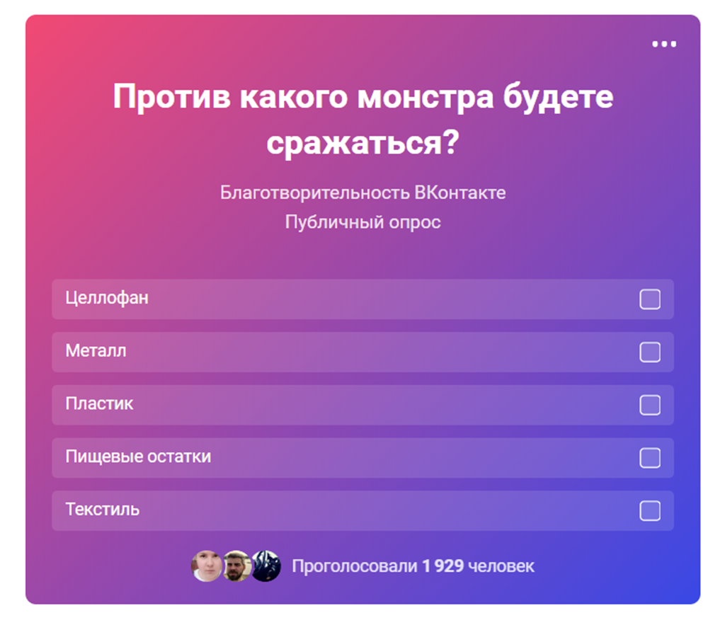 - Тесты: знаете ли вы, как сортировать мусор; куда отдать старые вещи; что сделать, чтобы стать донором, – пользователи отвечают на вопросы и получают баллы. Можно использовать как развлекательный формат или образовательный контент, главное – сделать его виральным.