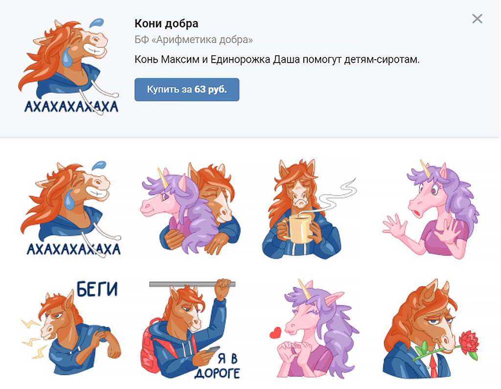К 1 сентября 2019 года «ВКонтакте» поддержал благотворительный фонд «Арифметика добра», выпустив благотворительные стикеры «Кони добра». Прибыль от их продажи была перечислена на образовательную программу «Шанс», в которой участвуют подопечные фонда. Героями стикерпака стали единорожка Даша и конь Максим. Стоит ли говорить, какую массу позитивных эмоций они вызвали у пользователей?