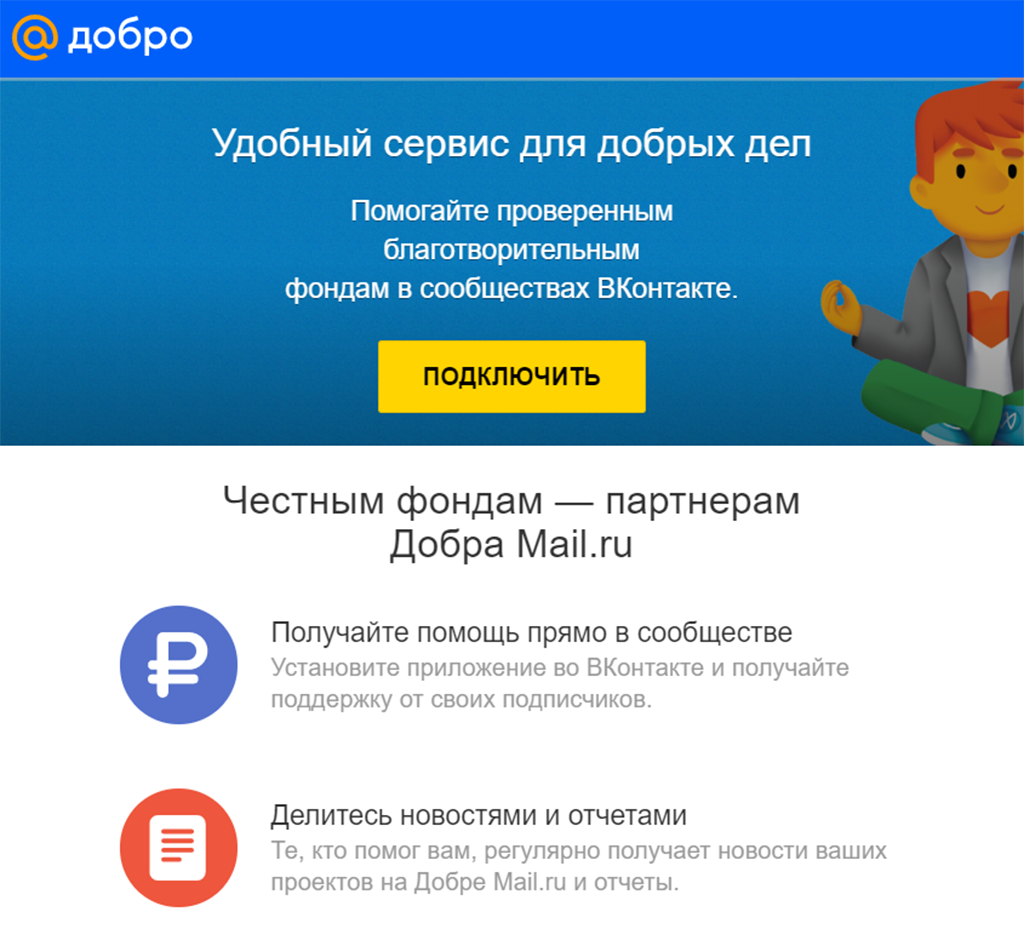 Например, пользователи «ВКонтакте» могут делать пожертвования проверенным фондам с помощью приложения Добра Mail.Ru. Здесь же можно подписаться на новости проектов, а после их завершения ознакомиться с финансовыми отчетами.