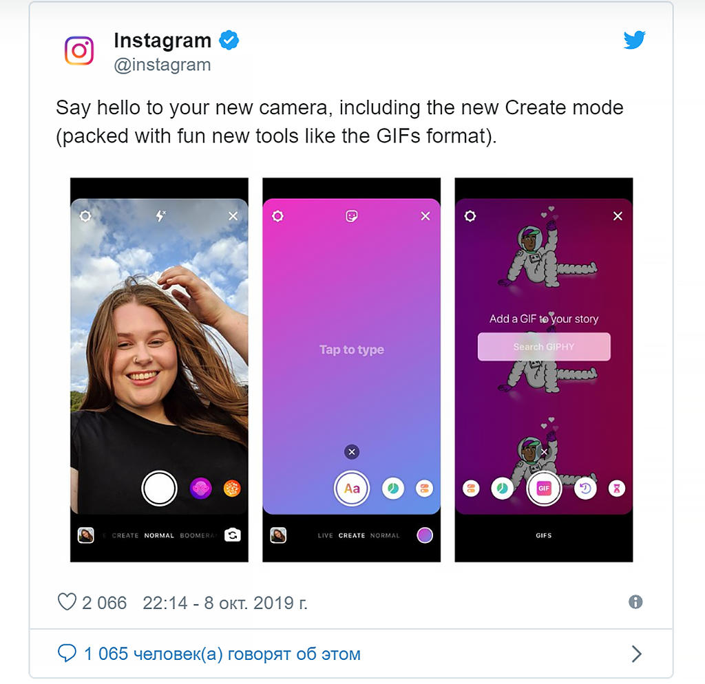 Новый формат камеры для Историй упрощает доступ к различным креативным инструментам, включая GIF-файлы, стикеры обратного отсчета и опросы, прямо из основного экрана. Ключевое обновление интерфейса создания Историй – замена старой опции «Печать» на новый режим «Создать», в котором и находятся сразу все доступные инструменты для творчества. Теперь нет необходимости добавлять их с помощью стикеров или других форм.