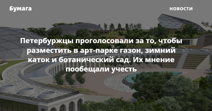 В Петербурге подвели итоги онлайн-голосования за наполненность арт-парка на проспекте Добролюбова. Результаты опроса, организованного городским союзом архитекторов, обещают учесть при написании технического задания для конкурса на концепцию парка. Итоги опубликованы на сайте Смольного.