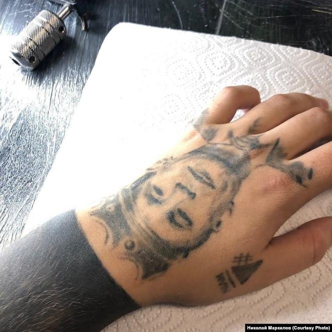 Поверх черного квадрата на руке Маркелов планирует набить белыми чернилами надпись "тут был Путин". Сейчас на его теле остались татуировки с портретами жертвы изнасилования Дианы Шурыгиной и ведущей развлекательных шоу Ксении Собчак.