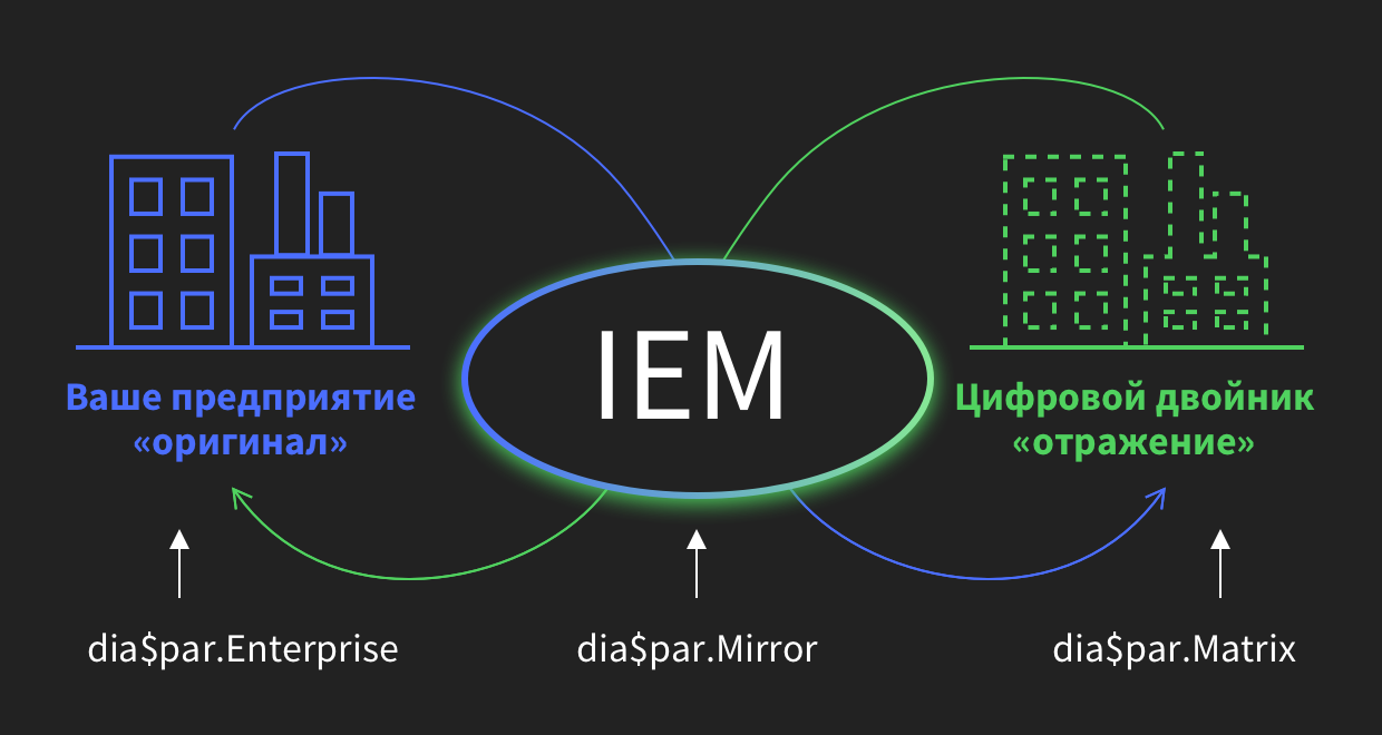 Вместо типового «отраслевого решения» ERP с фиксированной функциональностью IEM-система предлагает универсальную платформу быстрого и недорогого создания полноценного «цифрового двойника» компании — уникального, как и она сама, и во всех деталях отражающего реалии бизнеса управляемого предприятия. Сама же IEM-платформа выступает в роли кибернетического «зеркала» — причем двустороннего. Технологии IEM не просто отражают бизнес в «цифровой двойник», но и наоборот: бизнес-логика, заложенная в «цифровой двойник», управляет операциями компании в материальном мире и в реальном времени. Ultimate декларируют принцип «одна компания — один dia$par»: функциональность «цифрового двойника» IEM, по словам разработчиков, заменяет сразу весь ассортимент монофункциональных систем ERP-парадигмы (ERP, CRM, WMS, MES).