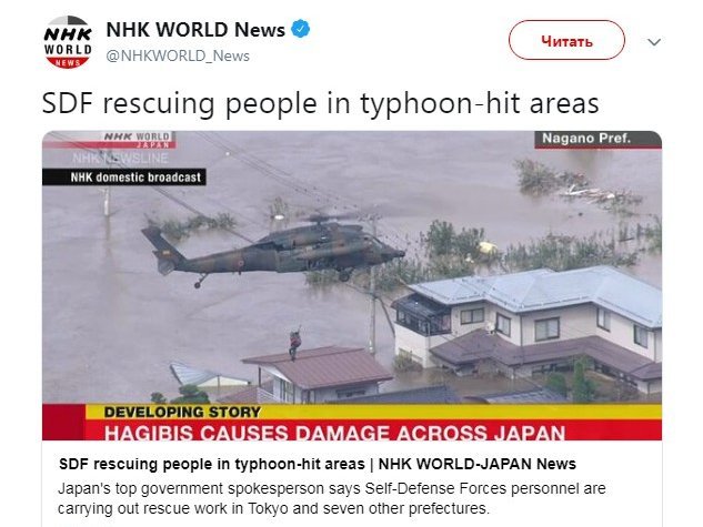 В Японии в результате тайфуна «Хагибис», обрушившегося на Японию 12 октября, погибли 18 человек и 16 пропали без вести, 149 человек получили ранения, пишет NHK.