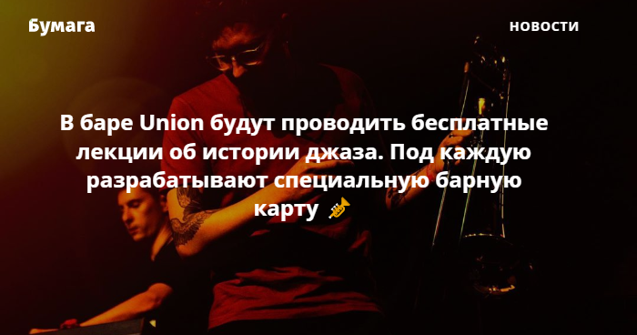 В баре Union на Литейном проспекте, 55 запустили образовательный проект «Джазфак». Это бесплатные лекции об истории джаза, которые проводятся раз в две недели. Под каждую из них разрабатывают специальную барную карту.