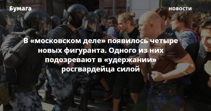 Следственный комитет сообщил о задержании четырех новых фигурантов «московского дела». Это Егор Лесных, Максим Мартинцов, Андрей Баршай и Владимир Емельянов. Им вменяют применение насилия в отношении представителей власти (ч. 1 ст. 318 УК).