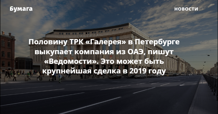 Компания из Объединенных Арабских Эмиратов Mubadala завершает сделку по покупке почти половины торгово-развлекательного центра «Галерея» у Московского вокзала в Петербурге. Об этом пишут «Ведомости» со ссылкой на два источника, близких к разным сторонам переговоров.