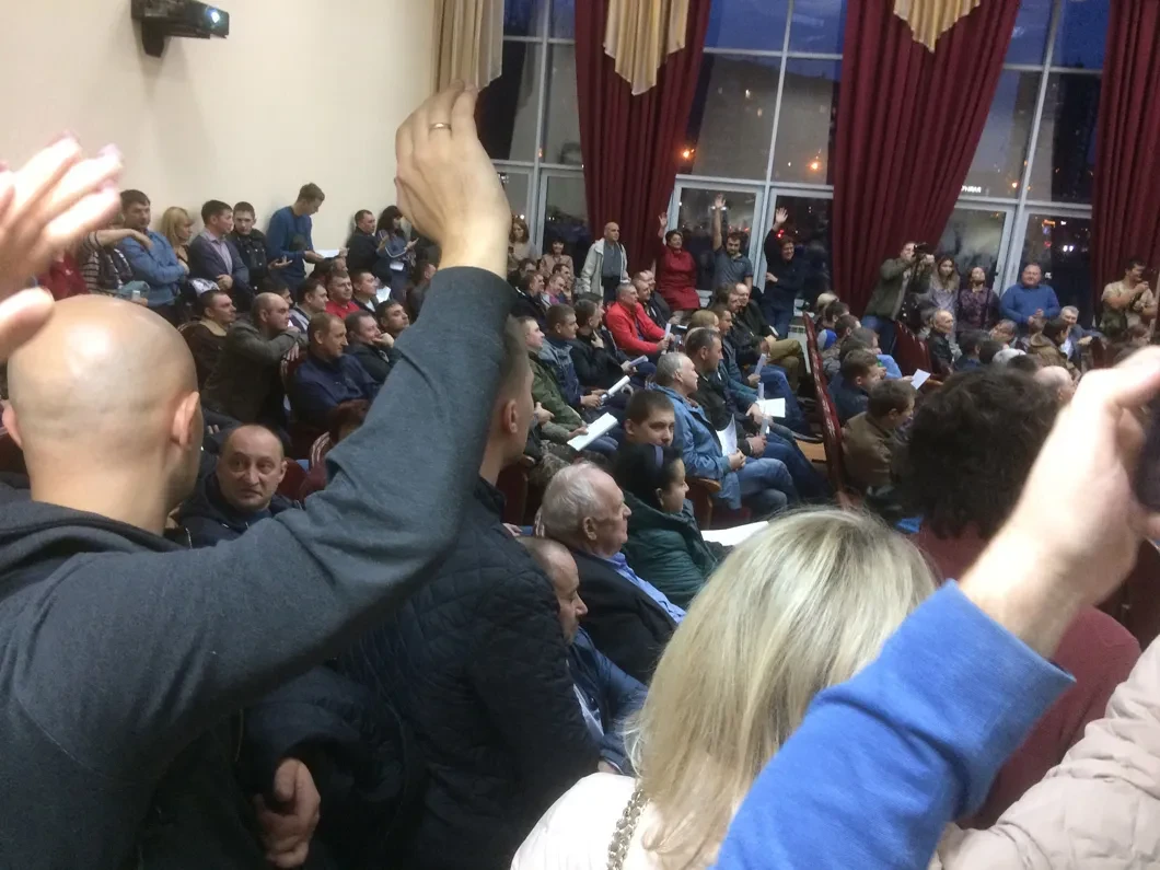 Кразовцы организованно приезжают в райадминистрацию первыми, за полтора часа. Курят, заходят и занимают почти все сидячие места. Прибывающие горожане располагаются вдоль стен, на подоконниках, на занесенных в зал скамьях.