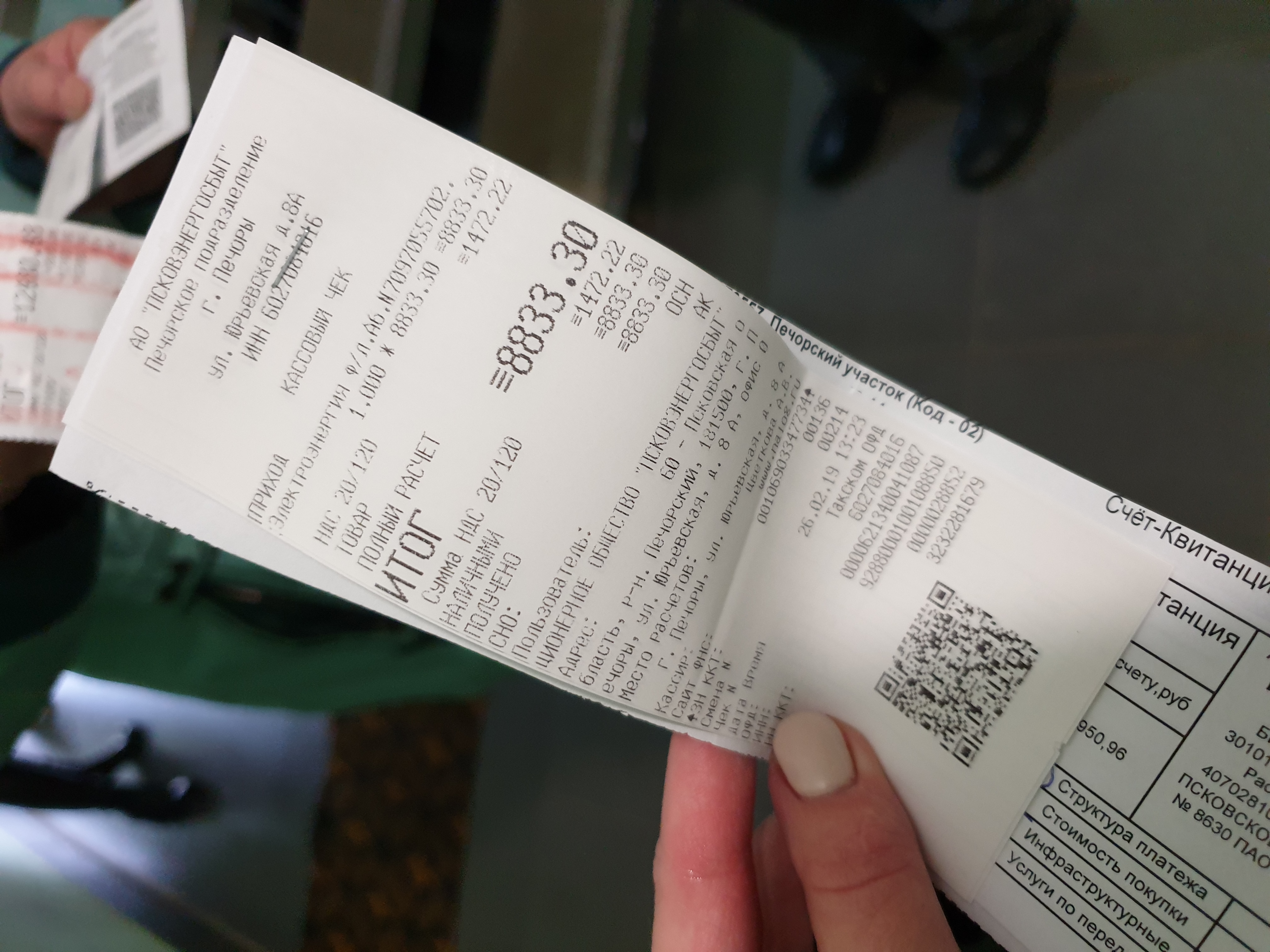 В доме нет газа, хотя изначально обещали, поэтому все пользуются электрическими плитами, а воду нагревает бойлер. Конвекторы также работают за счет электричества. Поэтому суммы в квитанциях "за свет" здесь в разы больше, чем в областном центре. Тамара Верьясова показывает чек от АО "Псковэнергосбыт" на 12 тысяч рублей, другие жильцы платят иногда по 8 тысяч рублей. При этом зарабатывают они не больше 15 тысяч рублей.