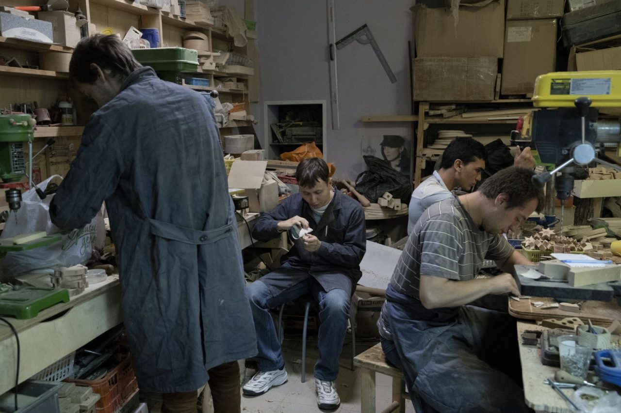 Миша обрабатывает наждачкой деревянную заготовку среди своих товарищей в «Артели блаженных»Фото: Андрей Любимов для ТД Некоторым родителям предлагают оставить малыша в роддоме, если особенности видны при рождении, кому-то намекают на то, что этот ребенок испортит им всю жизнь. В случае Татьяны фраза звучала так: «Ваш сын никогда не будет читать и писать». Из того же детского сада Миша однажды вернулся в синяках. Маме он сказал, что воспитатели не пускали его в туалет. Татьяна забрала его из сада и нашла новый.