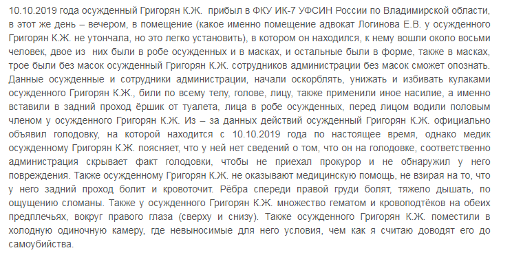О преступлении в отношении заключенного Борису рассказала адвокат Елена Логинова. По ее словам, в колонию она пришла 15 октября. Ее подзащитный Карен Григорян рассказал, что был жестоко избит сотрудниками УФСИН. В настоящее время Григоряна переводят из колонии №7 во Владимирский централ.