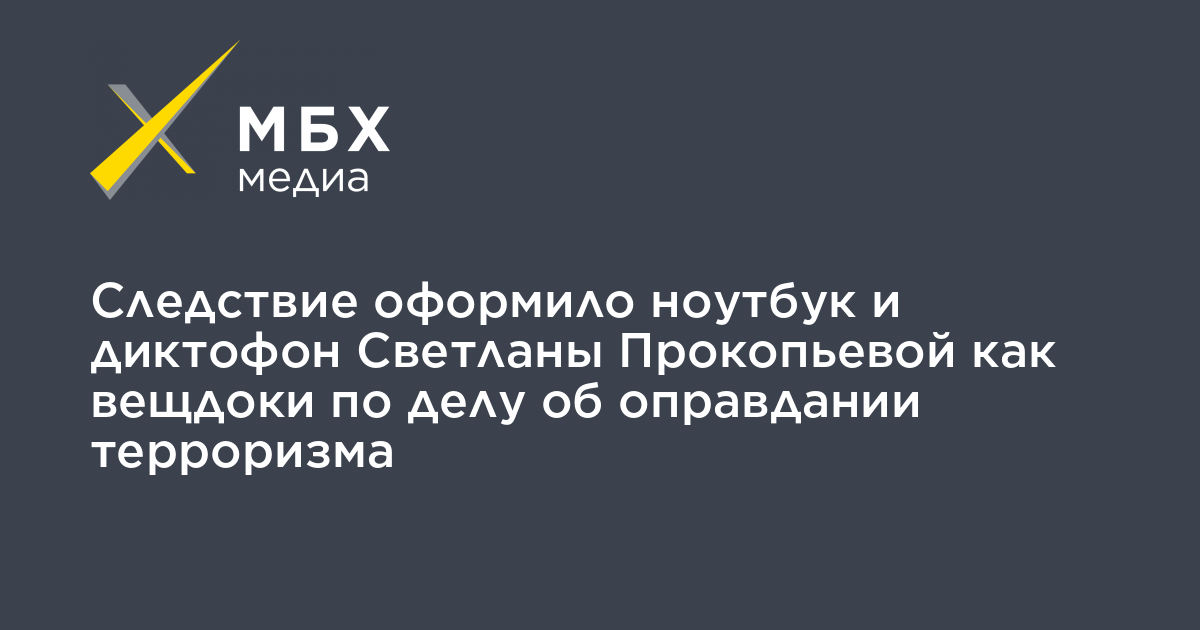 Следствие оформило рабочий ноутбук псковской журналистки Светланы Прокопьевой, ее диктофон, флеш-карту и личный телефон как вещественные доказательства по делу об оправдании терроризма. Об этом она сообщила МБХ медиа.