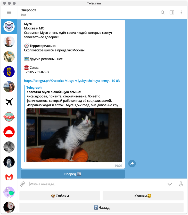 Команда волонтеров «Два пса», пристраивающая бездомных животных, запустила телеграм-бота «Зверобот». Это интерактивный каталог животных, которых можно взять домой (насовсем или на время) или поддержать деньгами — например, оплатить лечение. Создатели утверждают, что «Зверобот», возможно, первый подобный проект, созданный для телеграма.