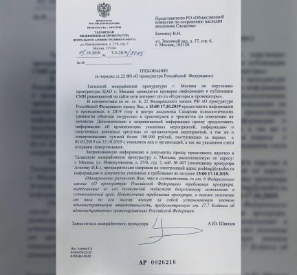 Из документа следует, что прокурорская проверка проводится по следам передачи НТВ «Кураторы и провокаторы». Силовиков интересуют данные о тренингах по поведению на митингах, тренингах «Винтаж по-русски», которые проводились на территории Сахаровского Центра, их организаторах и об их оплате.