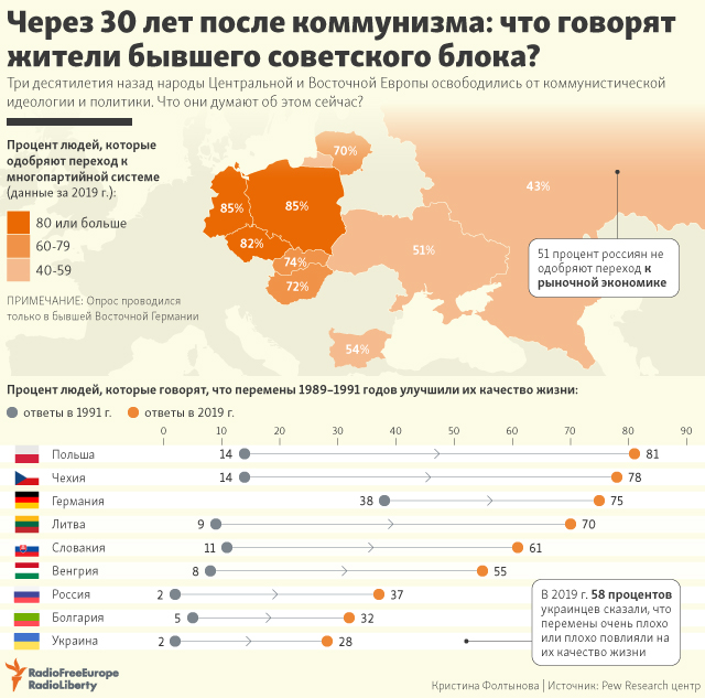 Антикоммунистические революции 1989 года происходили под лозунгом перехода от авторитаризма к демократии и от плановой к рыночной экономике. По большей части граждане бывших соцстран считают, что не ошиблись в выборе. Так, переход к многопартийной политической системе одобряют 85% опрошенных поляков и жителей бывшей ГДР, 82% чехов, 70% литовцев – но лишь 54% болгар, 51% украинцев и 43% россиян. (Россия – единственная страна, где многопартийность симпатична меньшинству населения).