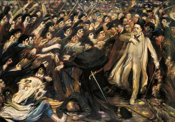 Анри де Гро. Глумление над Золя. Холст, масло. 1898 Пищикова: Вы ищете объяснения? И скажите: актуализируете ли вы эту историю? Вы пишете про глумление, но обдумываете ли события вокруг Майдана, скажем? Победа, радость, но происходит ряд событий, которым я тоже искала объяснения. Торжество добродетели, но при этом на какой-то короткий период возвращается дремучее: враг должен ползти на коленях, проворовавшийся чиновник возим по городу в мусорке.