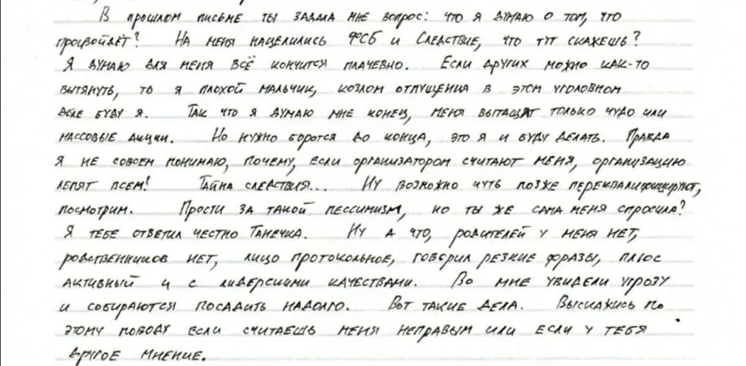 «Ну а что, родителей у меня нет, родственников нет, лицо протокольное, говорил резкие фразы, плюс активный и с лидерскими качествами. Во мне увидели угрозу и собираются посадить надолго», — писал Костыленков своей подруге.