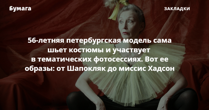 Петербургская модель 1962 года рождения Марина Бадьянова повторяет образы миссис Хадсон, старухи Шапокляк, а также воительниц и ведьм. Она сама шьет себе костюмы и участвует в тематических фотосессиях.