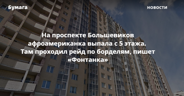 Днем 19 октября из окна пятого этажа 15-этажного многоквартирного дома на проспекте Большевиков, 11/2 выпала женщина. Ее госпитализировали в тяжелом состоянии. Как пишет «Фонтанка», до этого к ней в квартиру пришли мужчины, которые считали, что там располагается бордель.