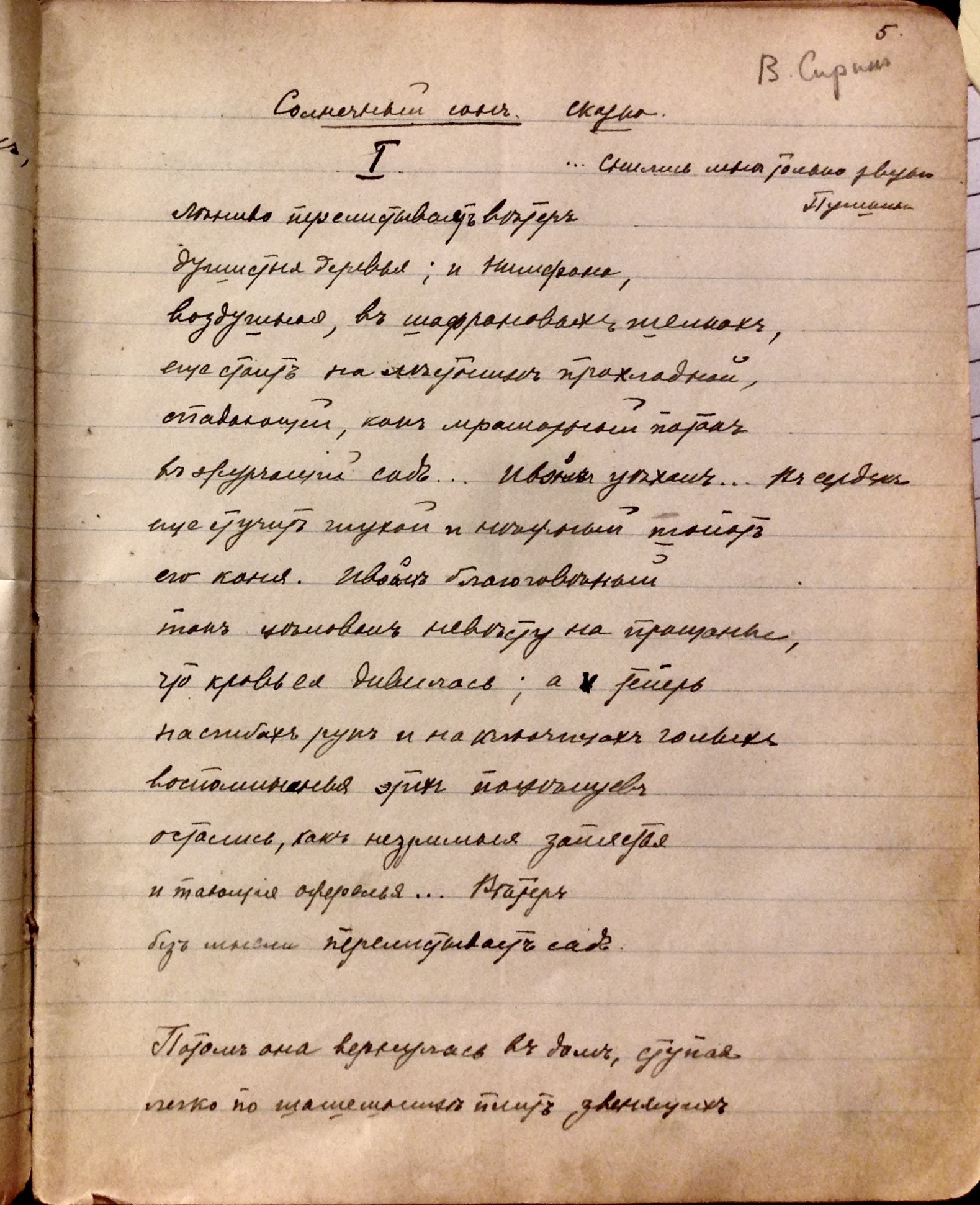 У этой рукописи особая история, поскольку нет автографа Набокова, а есть переписанный рукою матери, Елены Ивановны Набоковой, текст в ее тетради со стихотворениями самых разных поэтов, с вырезками из газет и журналов того времени. И вот среди этих стихотворений Гумилёва, Одоевцевой, Бунина, без какого-либо отдельного предисловия или послесловия записан текст под названием "Солнечный сон. Сказка". С эпиграфом из "Бориса Годунова": "А снилися мне только звуки". У этой строки тоже есть своя история, она не случайно вынесена в эпиграф.