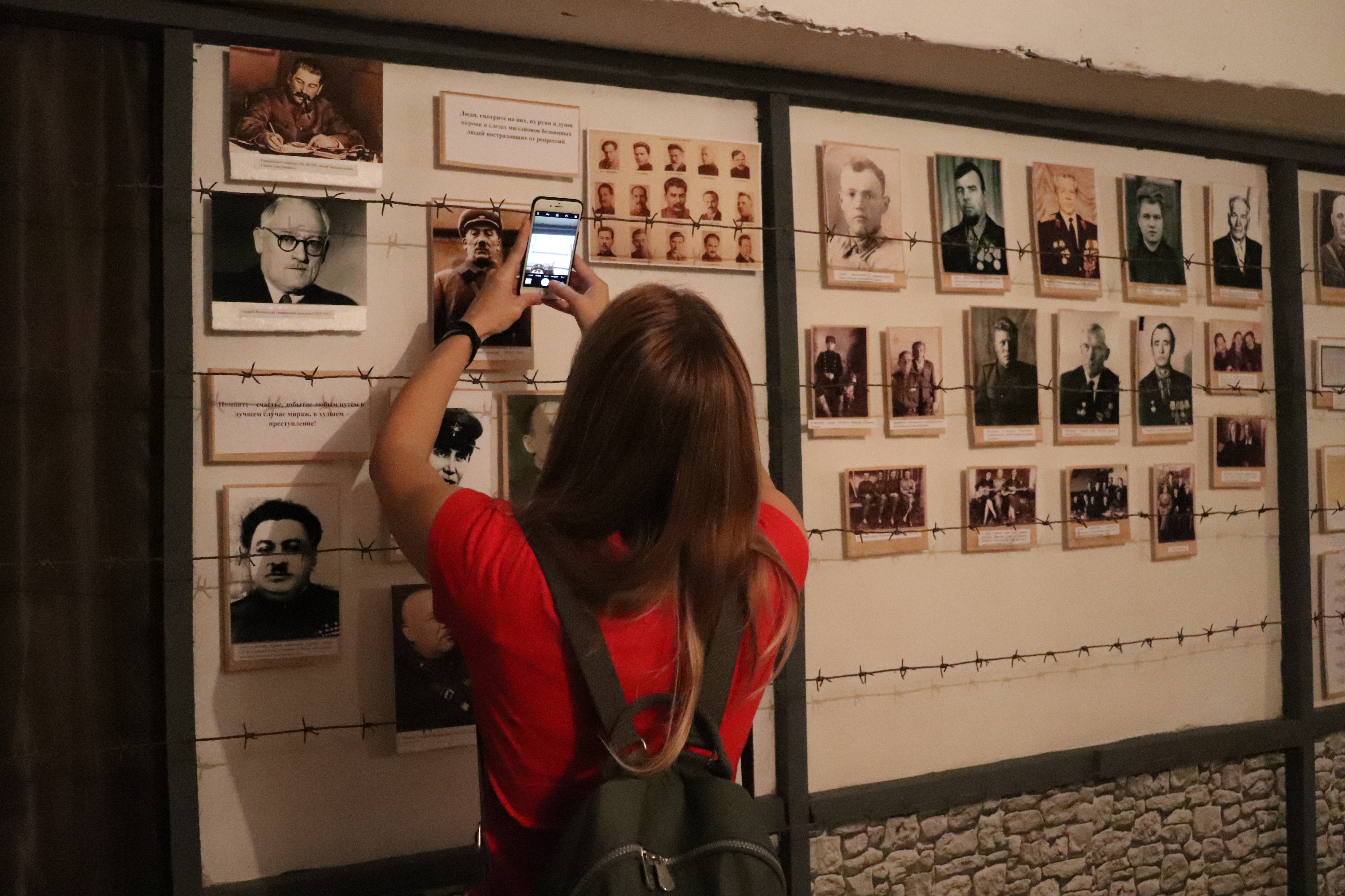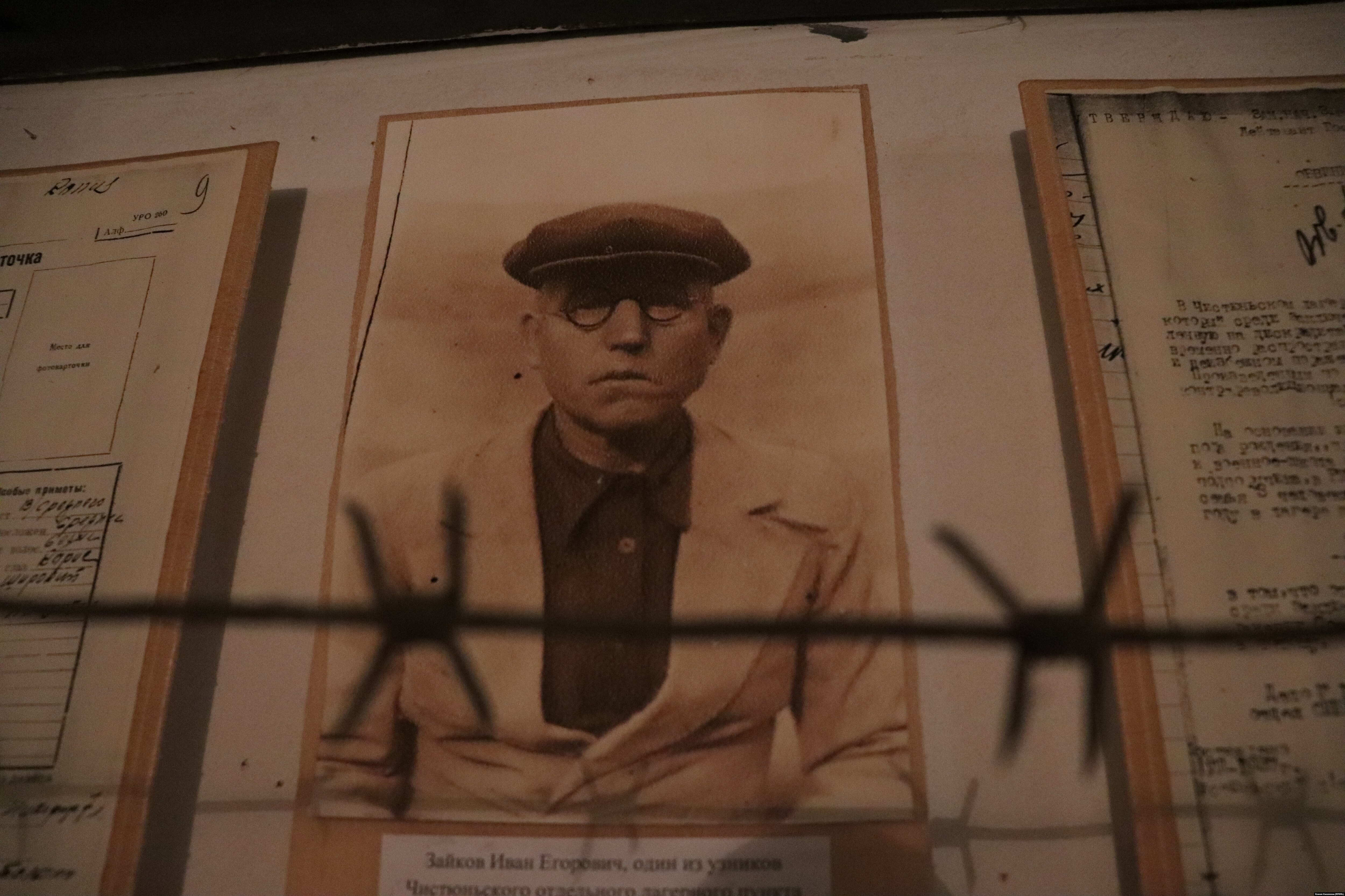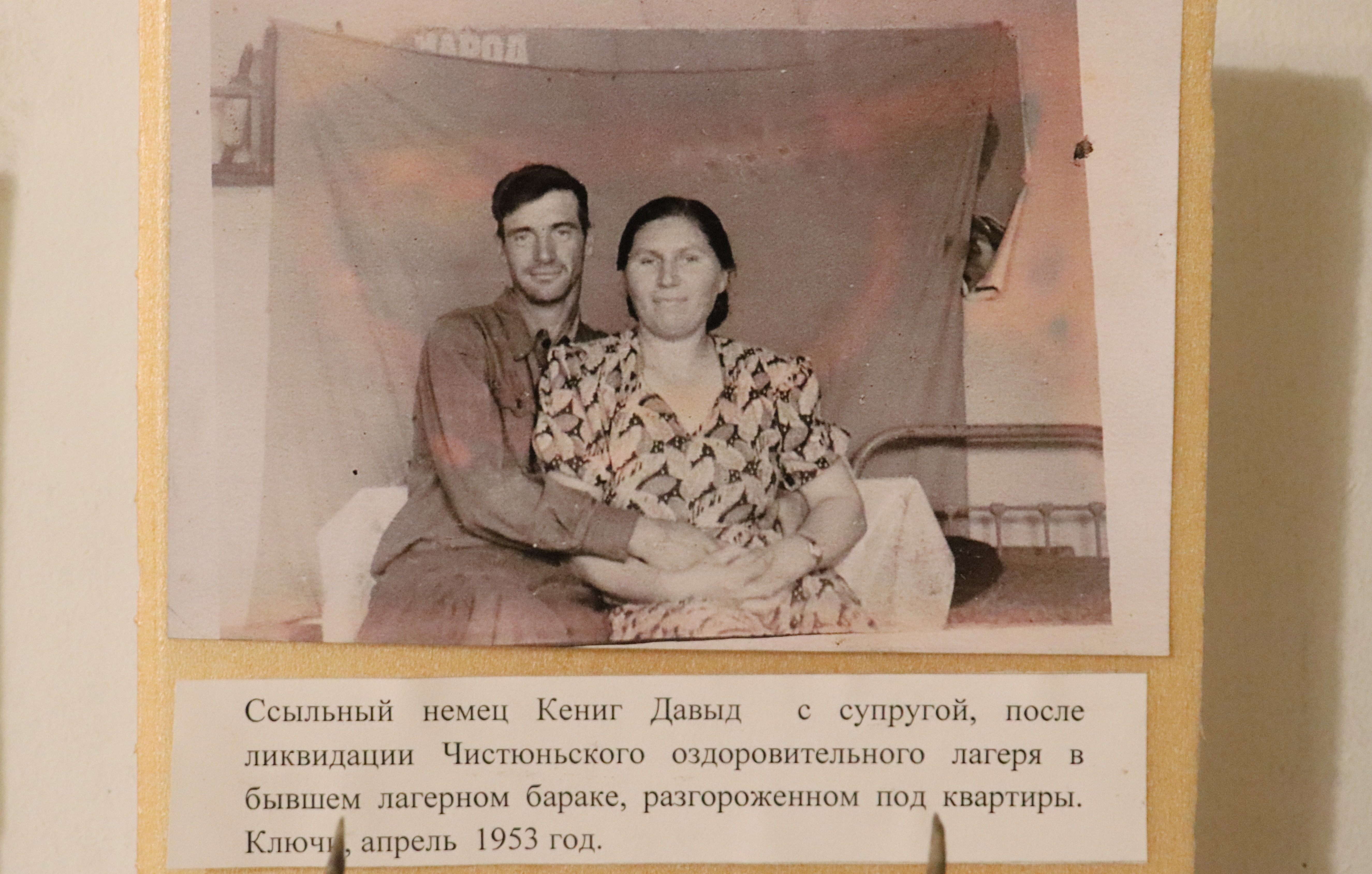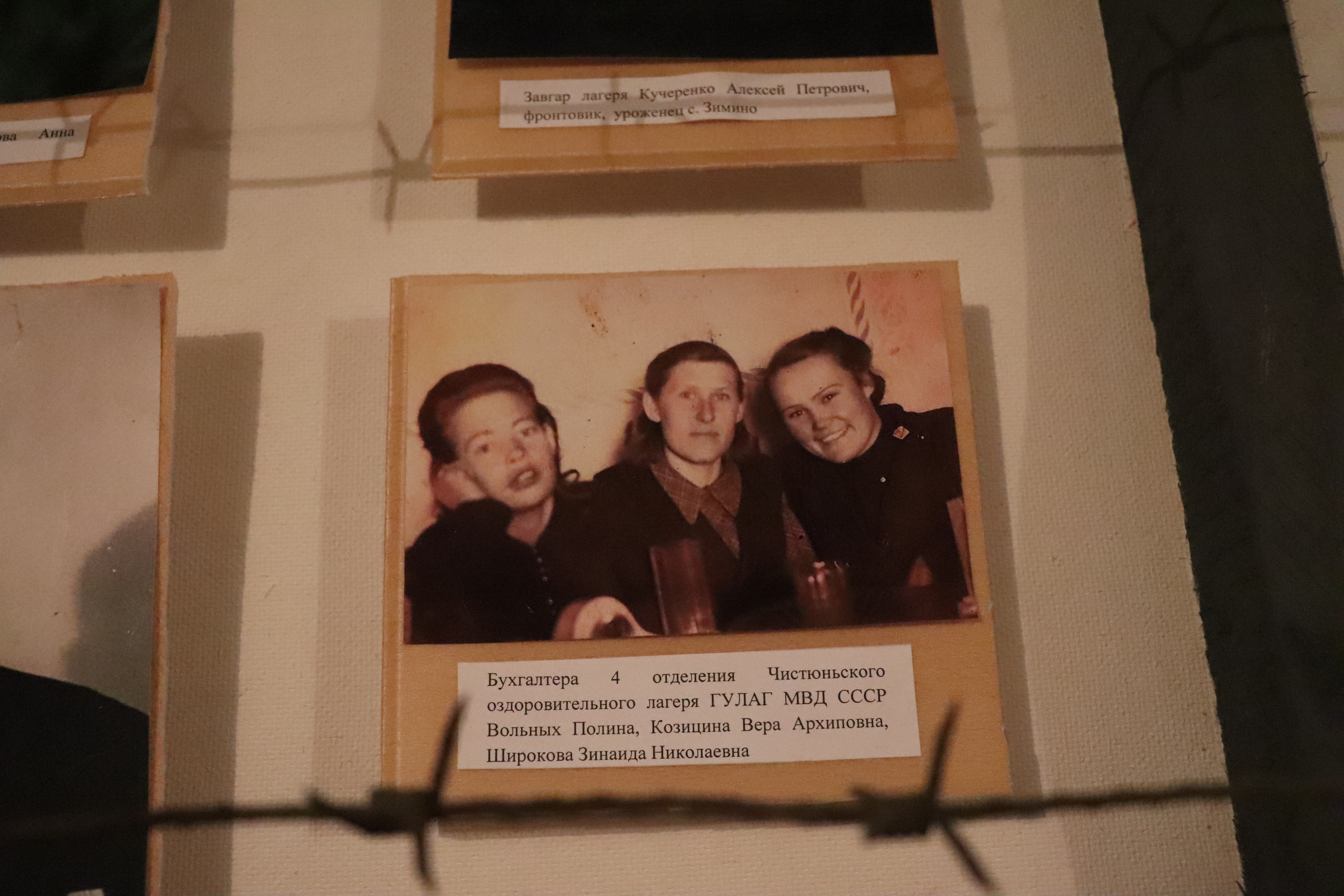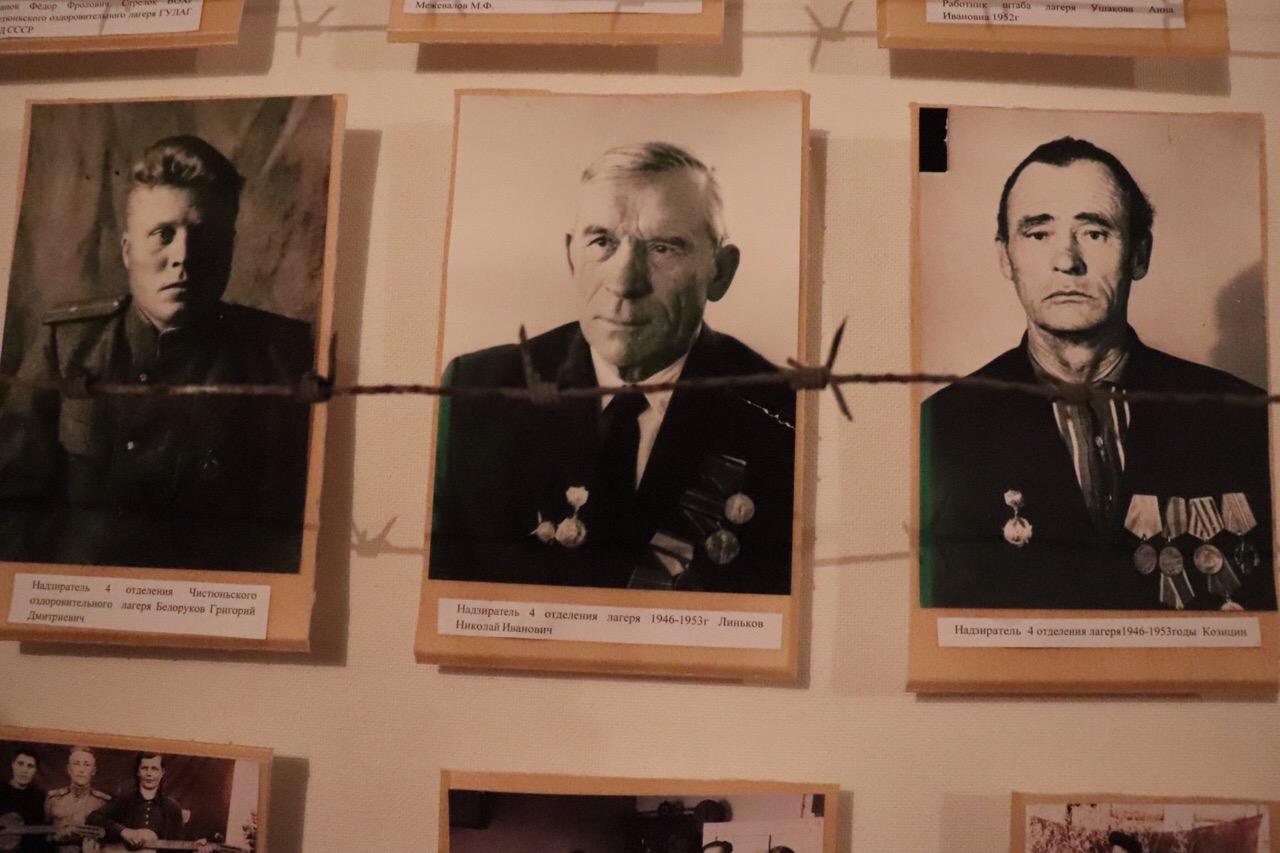 Экспозиция Чистюньгала размещается в подвале музея в Топчихе, где также расположен ЗАГС. На стенах – множество артефактов: фото лагеря, его обитателей, "вертухаев", схемы размещения объектов, которые удалось восстановить. Мы спускаемся по темной лестнице вместе со Светланой Тельновой, Еленой Басмановой и Анной Бочило. Они всматриваются в фотографии охранников лагеря.