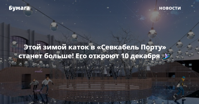 Каток в «Севкабель Порту» планируют открыть для посетителей 10 декабря. Площадка станет в два раза больше, чем годом ранее. Одновременно на ней смогут кататься 300 человек. Об этом пишет журнал «Собака» со ссылкой на представителей пространства.