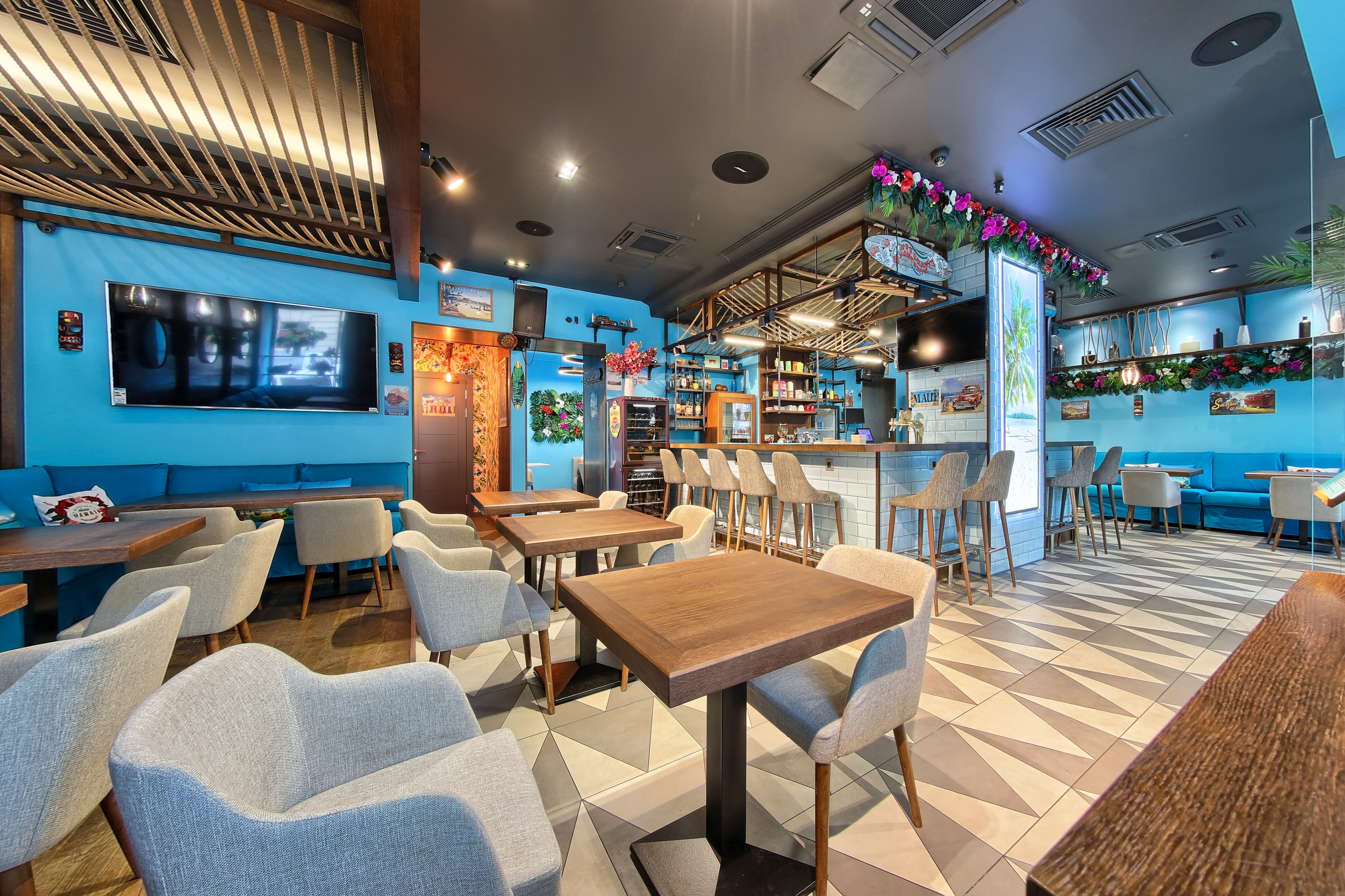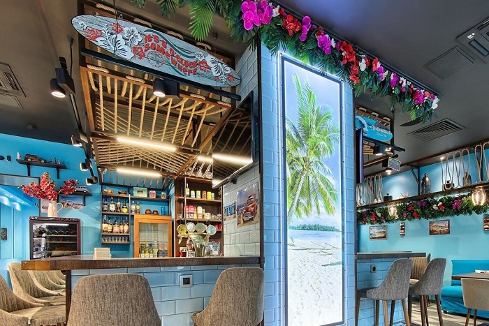 В меню напитков — самодельные тропические чаи, тики-коктейли и пиво. Интерьер оформлен в гавайском стиле: зал украшен цветочными тропическими гирляндами и зеркалами-иллюминаторами.