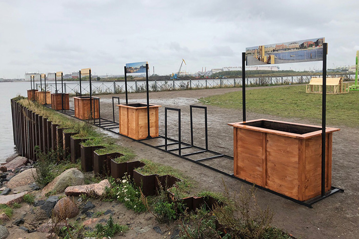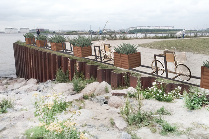 - Участники Waterfront, которые работали над развитием участка пляжа на Юго-Западе, установили кадки с растениями, совмещенные с велопарковкой, в качестве ограждения над обрывом Финского залива.