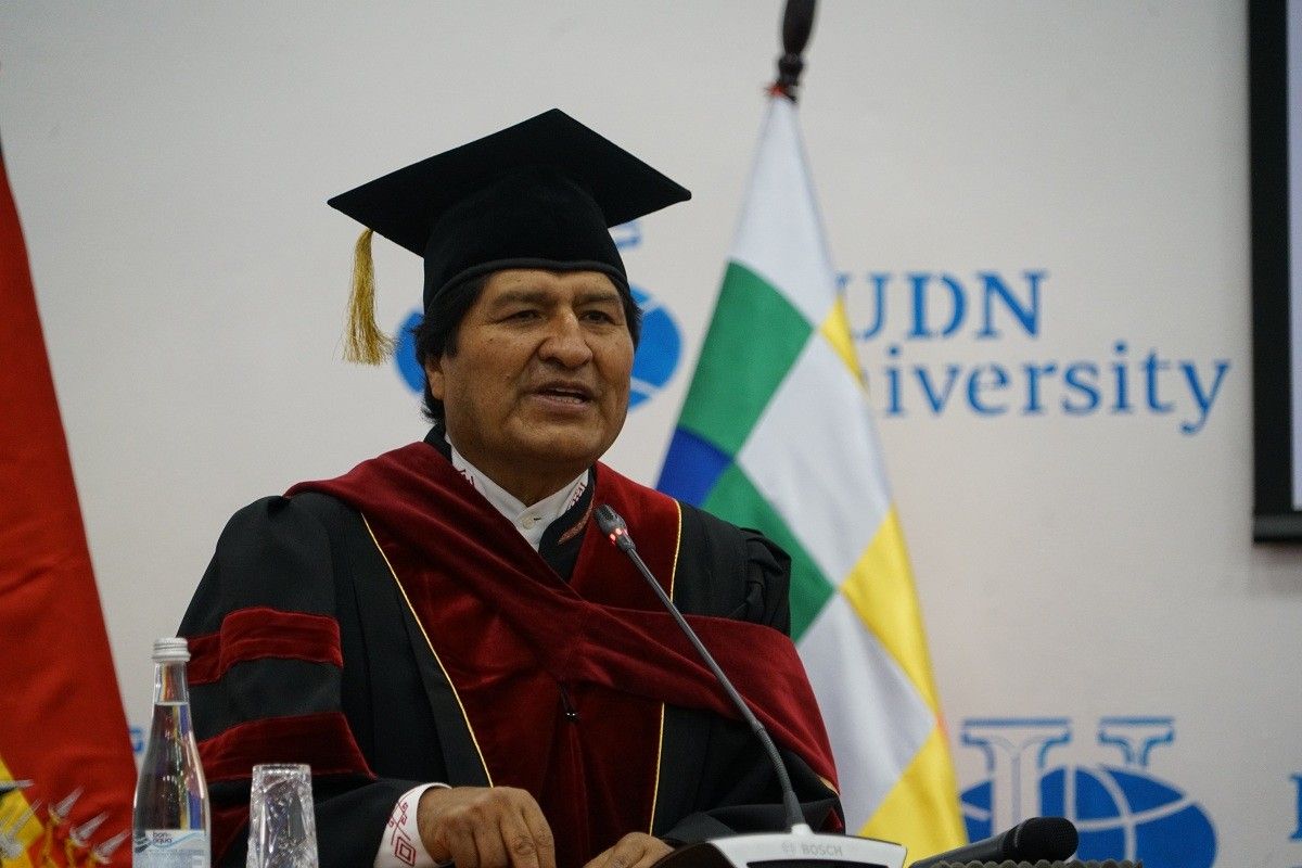En julio de 2019, se celebró una ceremonia solemne en la Universidad Rusa de la Amistad de los Pueblos (RUDN) en Moscú para entregar el título de Doctor Honoris Causa a un hombre que ni siquiera tenía una licenciatura y que se había hecho famoso mascando una hoja de coca en una conferencia de la ONU. “Medio raro suena doctor Evo”, dijo el presidente boliviano, fascinado con el título. Morales ha gobernado Bolivia durante casi 14 años, período en el cual ha visitado varias veces Moscú, donde se le ha recibido siempre con la misma simpatía. Después de la ceremonia en RUDN, visitó el Kremlin, donde se reunió con el líder ruso Vladimir Putin. La visita concluyó con la firma de numerosos acuerdos entre ambas naciones.