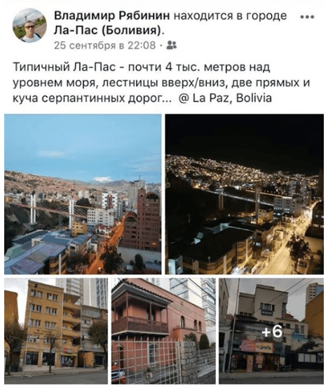 Как минимум с 4 июня они уже были в Ла-Пасе. В этот день политтехнолог Владимир Рябинин выложил в своем Facebook первую фотографию из этого города. Он публиковал их и дальше, вплоть до 25 сентября.